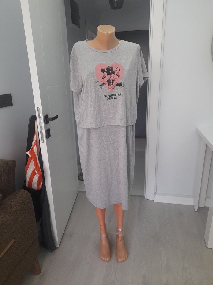 Gri renkli, pamuk kumaştan yapılmış hamile elbisesi, kısa kollu ve yuvarlak yakalıdır. Mickey Mouse baskısı ile rahat ve günlük kullanıma uygundur.