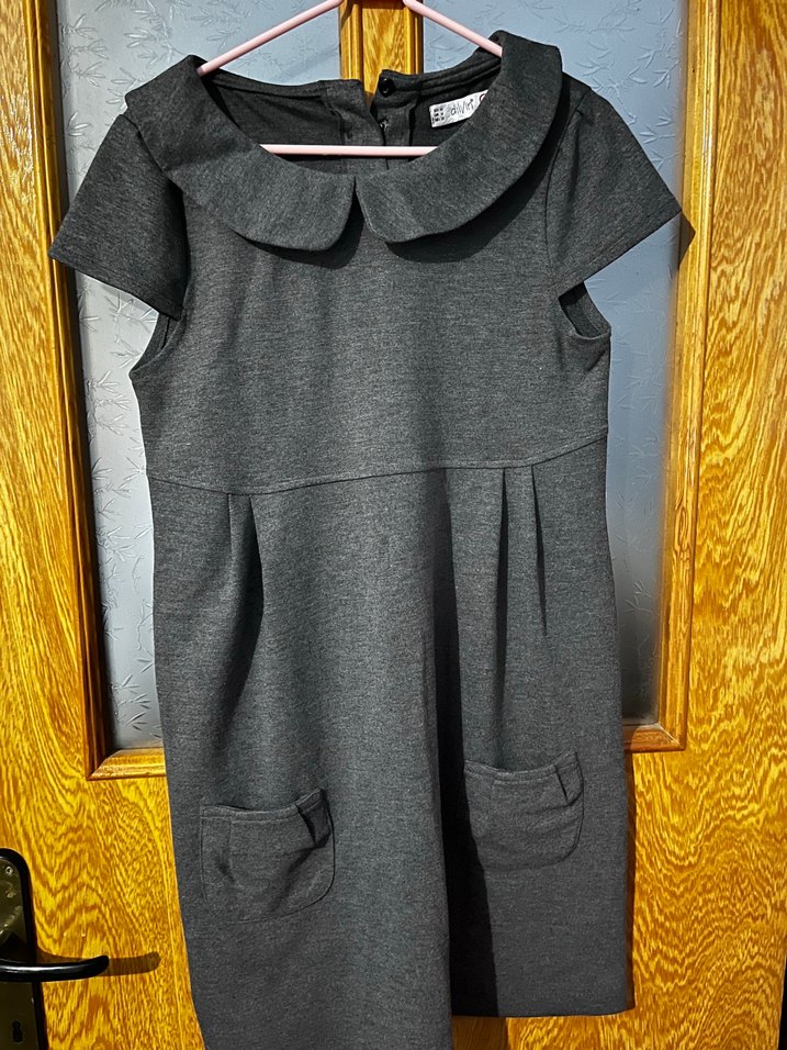 Gri midi hamile elbisesi, yakasında fırfır detayları ve kısa kolludur. Bol kesim, iki ön cep içerir. Yumuşak ve sıcak kumaştandır. Günlük kullanıma uygundur.