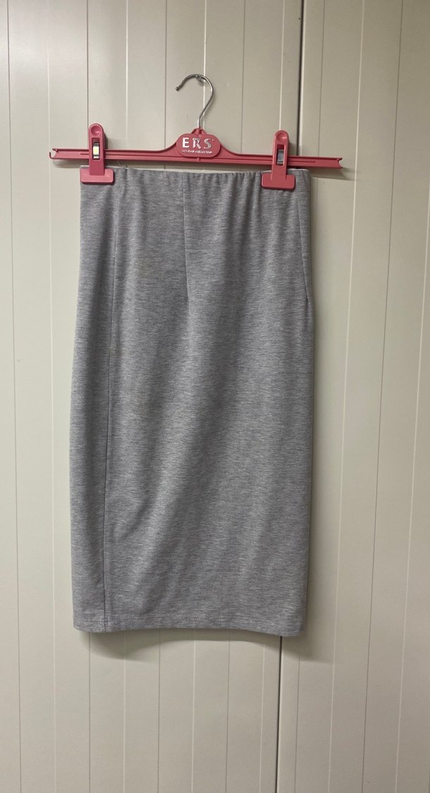 Gri renkte, düz ve desen içermeyen, midi boy, vücuda oturan hamile eteği. Sentetik kumaştan, günlük sokak stili için uygun. ERS askıda.