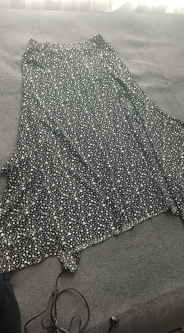 Yumuşak sentetik kumaştan, fırfırlı detaylı, gri midi hamile eteği. Sokak tarzı ve açık hava kullanımı için uygundur.