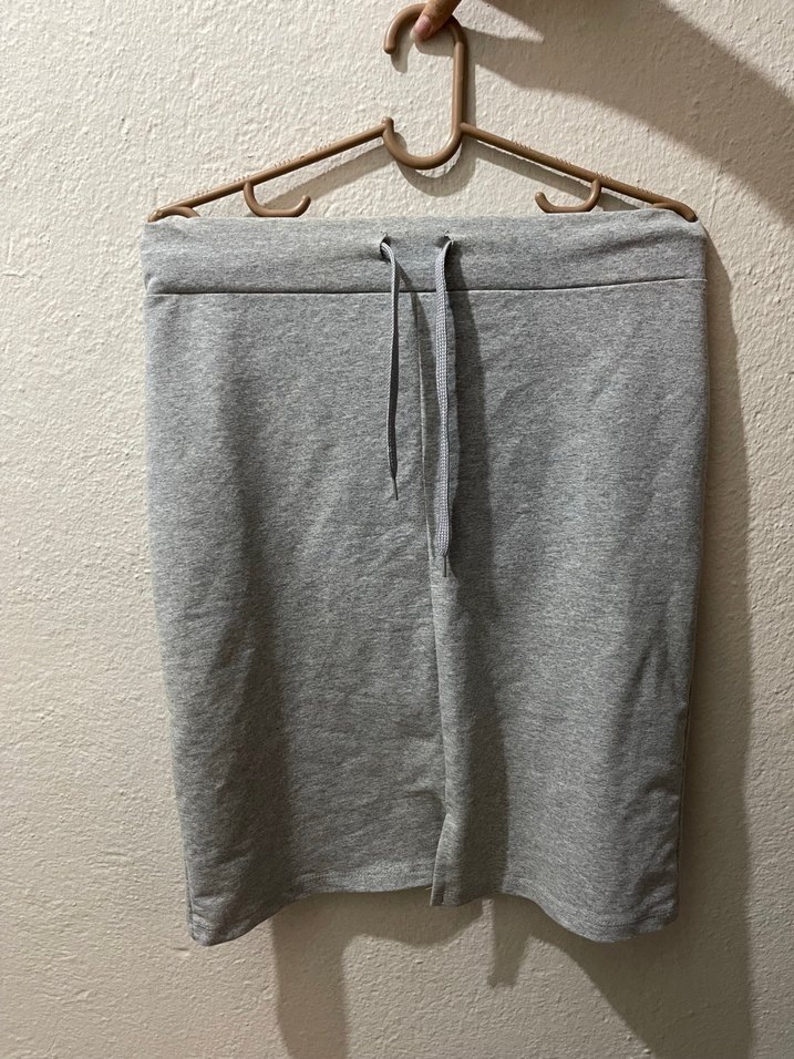 Yumuşak pamuklu, rahat kesim gri midi hamile eteği, günlük kullanım için konforlu ve sade tasarıma sahiptir. Belinde bağcık detayı bulunur.
