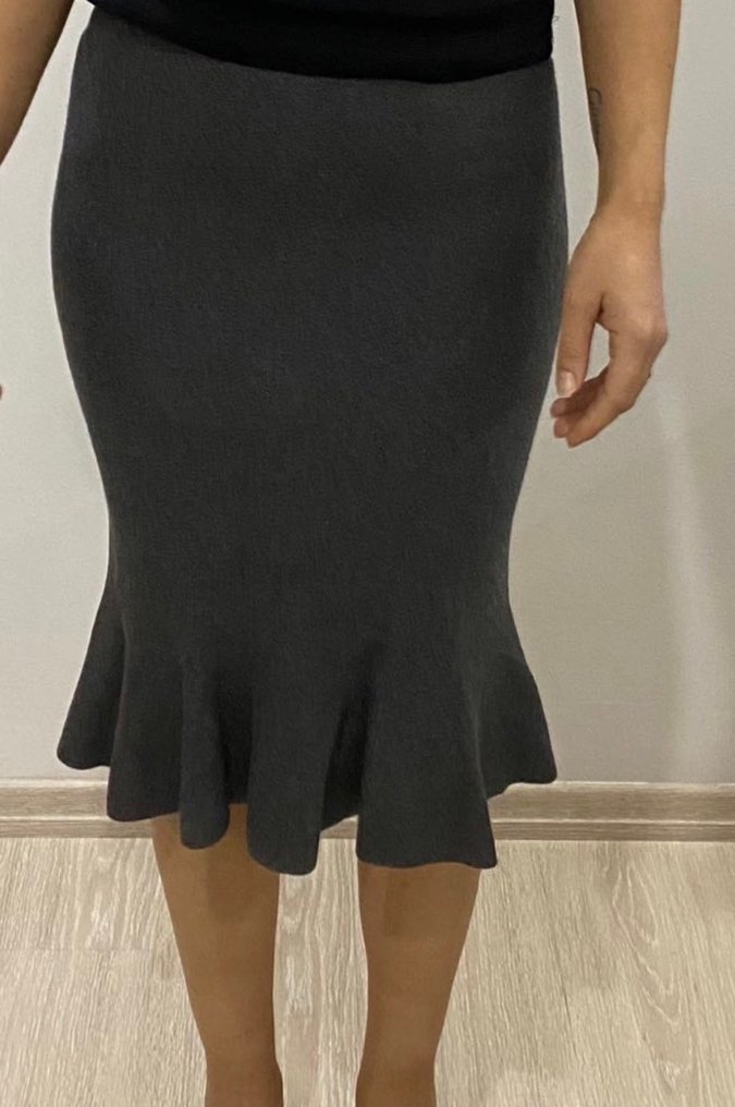 Gri renkte, volan detaylı, vücuda oturan midi etek Ofis kullanımı için uygun, yumuşak sentetik kumaştan üretilmiştir. m bedenede rahat olur