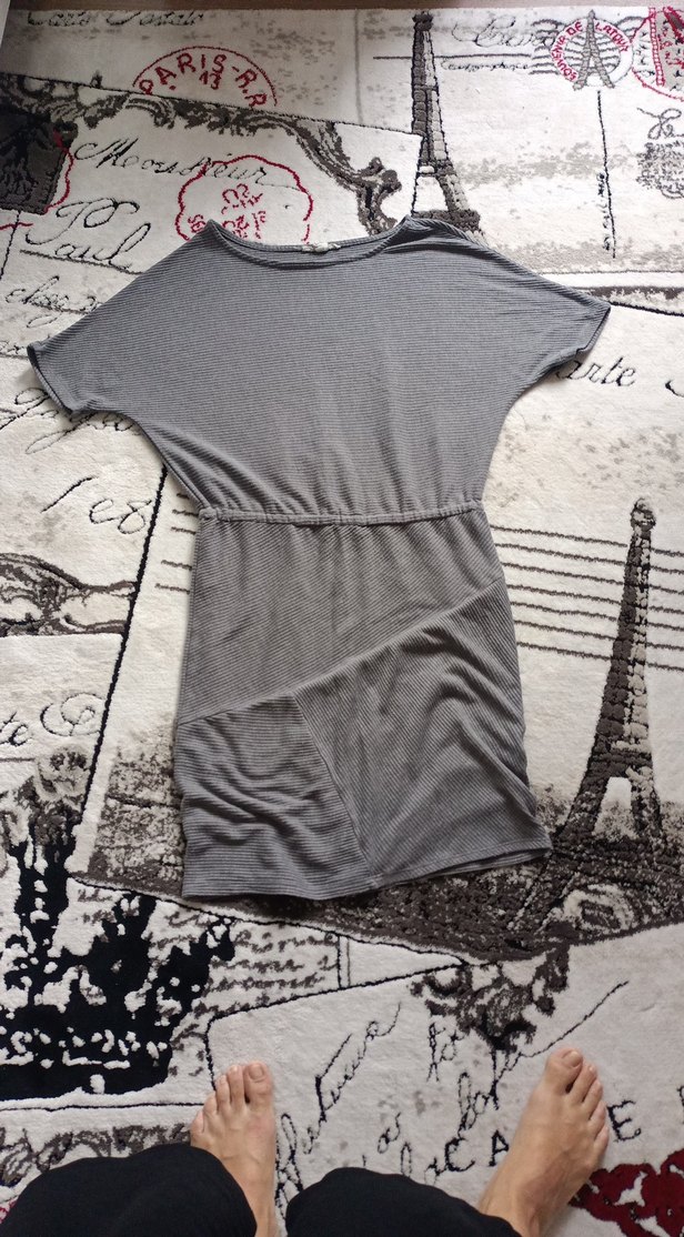 Gri renkli, kısa kollu, midi boy hamile elbisesi, dar kesim ve yuvarlak yaka ile günlük sokak stiline uygun. Yumuşak sentetik kumaştan drapeli tasarım.