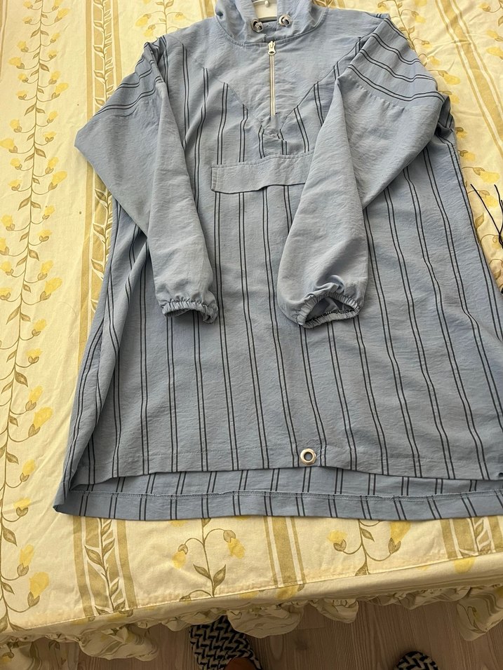 Gri keten kumaştan, düğmeli, uzun kollu, yakalı ve bol kesim midi hamile ceketi. Günlük sokak stili için uygundur.