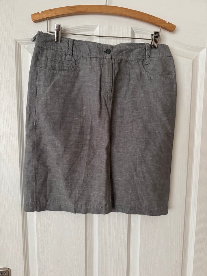 Gri midi uzunlukta, keten kumaştan yapılmış, bol kesim hamile eteği. Desensiz ve rahat, ofis için uygun şık bir tasarım.