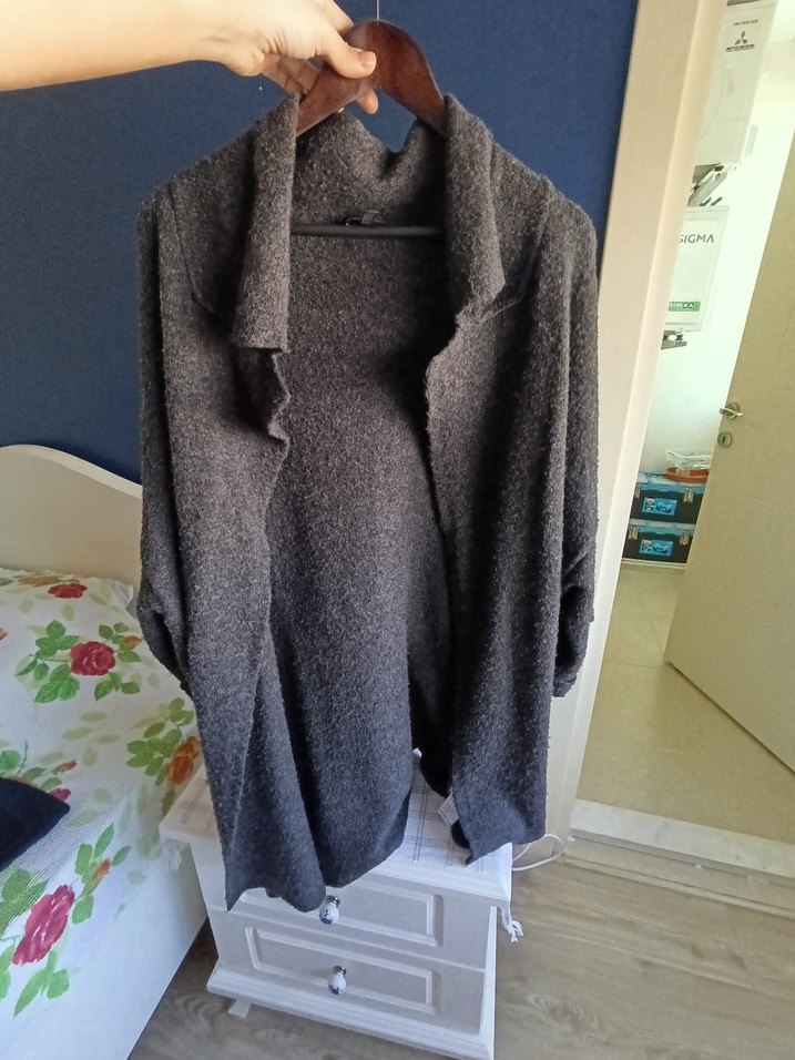 Gri örgü yünden yapılmış, bol kesim midi uzunluğunda kadın hırka. Günlük kullanıma uygun sade ve rahat tasarım. Sadece bir kaç kere giydim. Kemerle yada önü açık şık oluyor.