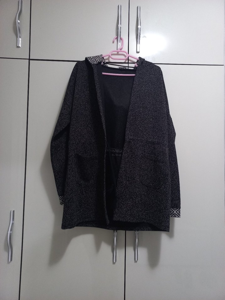 Gri örgü yün karışımlı, uzun kollu, notalı yakalı, rahat günlük kullanım için uygun. L-XL beden için uygun