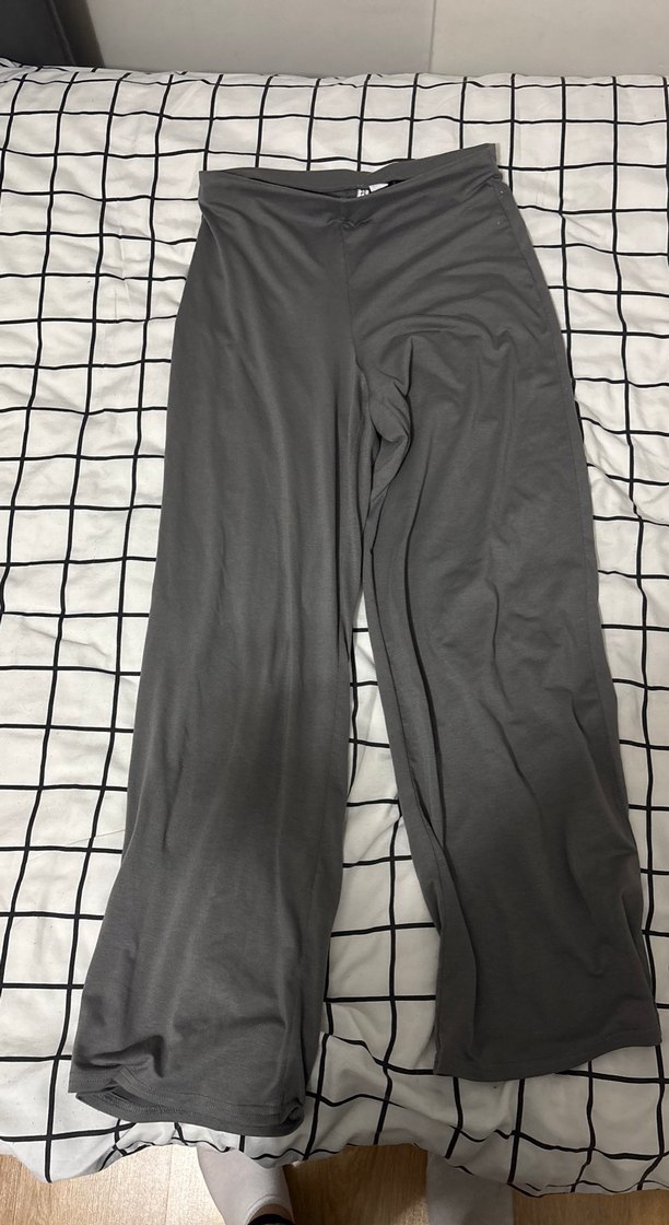 Gri midi boy, bol kesim bu pantolonlar, yumuşak sentetik kumaştan yapılmış olup günlük şıklık için zahmetsiz bir tarz sunar.