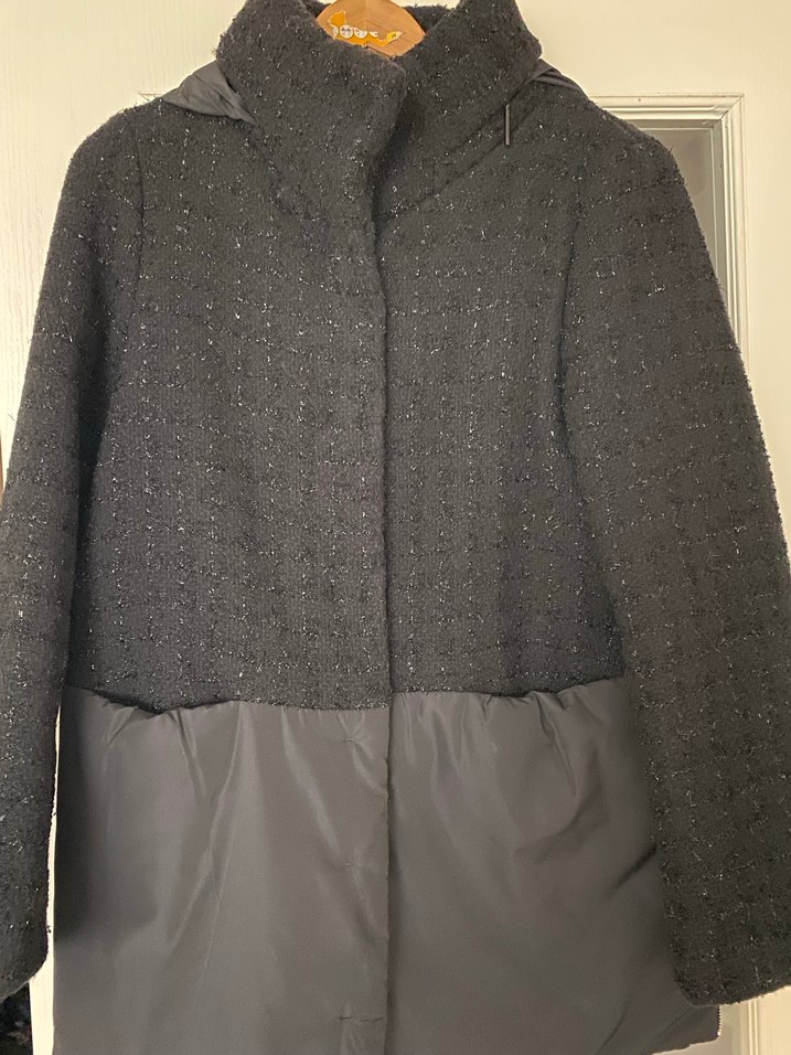 Kadın ceketi, düğmeli ve kesik yaka detaylıdır. Üst kısmı dokulu, günlük kullanıma uygundur , yandan fermuarlı hem spor hem de klasik üst bölüm simli