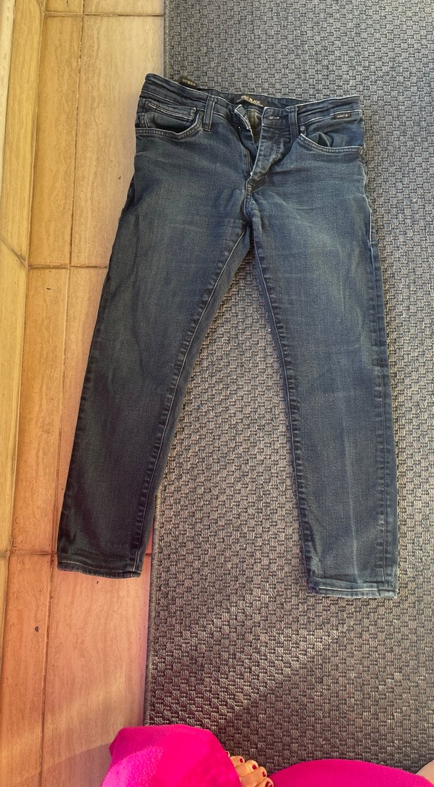 Gri midi boy kadın denim jean, regular fit ve tokalı detaylı, günlük sokak stiline uygun.