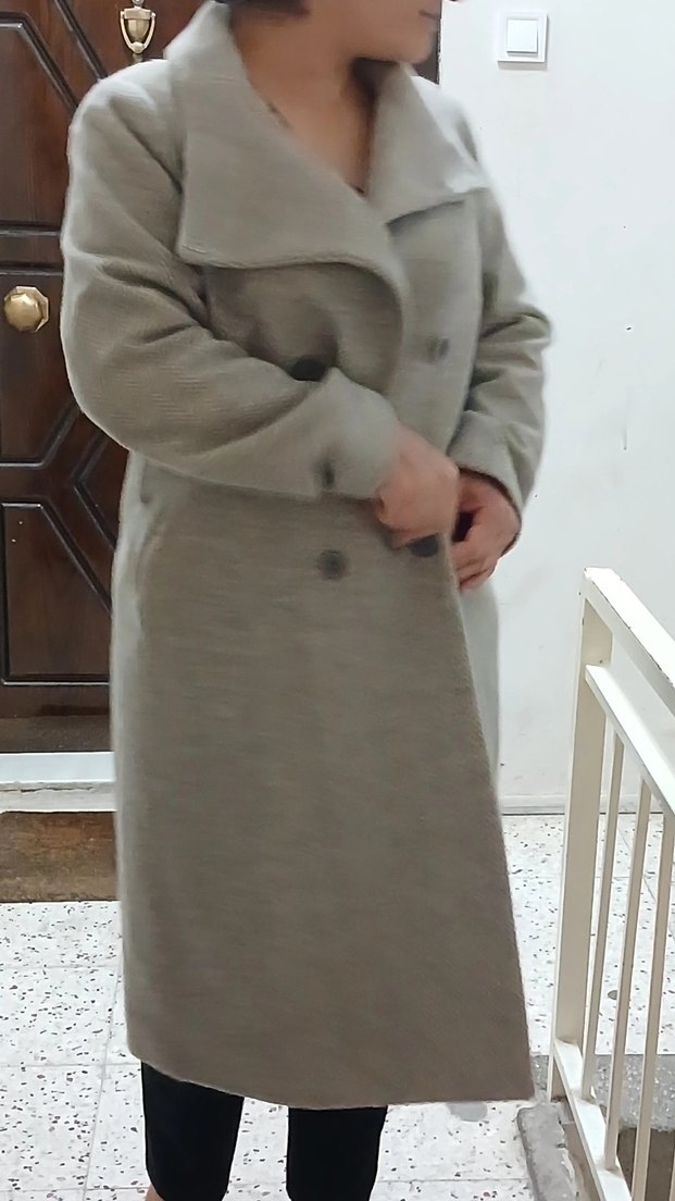 Gri midi kaban, düğmeli ve kesimli yaka detayına sahiptir. Rahat kesimi ve uzun kollu, yumuşak ve sıcak kumaştan üretilmiştir.