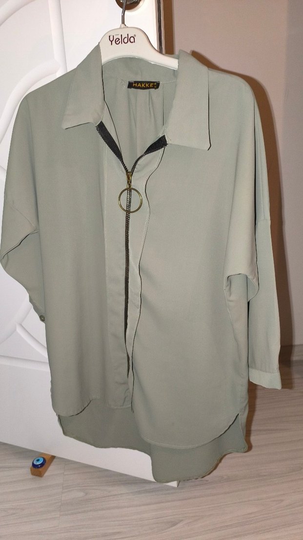 Geniş kesim, yakalı, uzun kollu, fermuarlı ve ipeksi dokulu gri midi kadın gömlek, günlük rahat stil için uygun. ✨