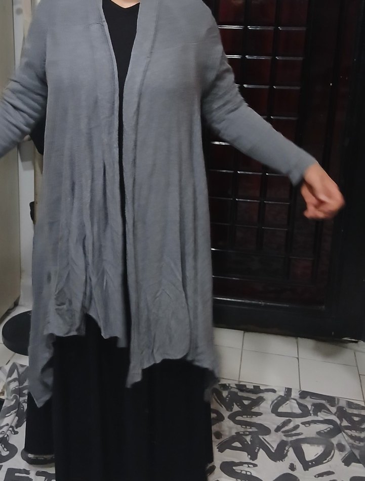 Gri renkte, keten kumaştan midi uzunlukta, bol kesim, dökümlü ve yakası kesimli kadın hırka. Uzun kollu ve desensizdir, günlük rahat kullanıma uygundur.