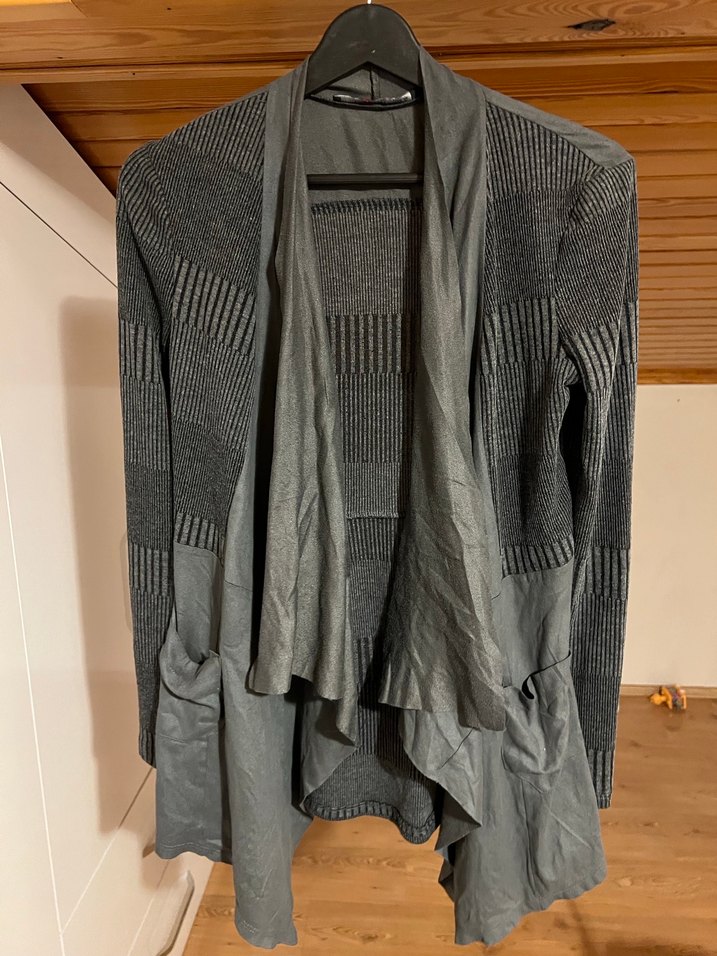 Gri midi hırka, dökümlü yakası ve uzun kollarıyla rahat bir kesime sahiptir. Yumuşak keten kumaştan üretilmiş, modern ve konforlu bir tasarımdır.