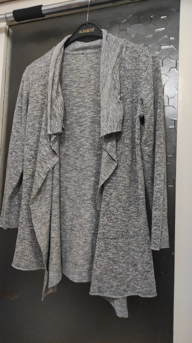 Gri midi uzunlukta, dökümlü ön kısmı ve yaka detaylı, uzun kollu kadın hırka. Yumuşak keten kumaştan, salaş kesim ve desensiz.