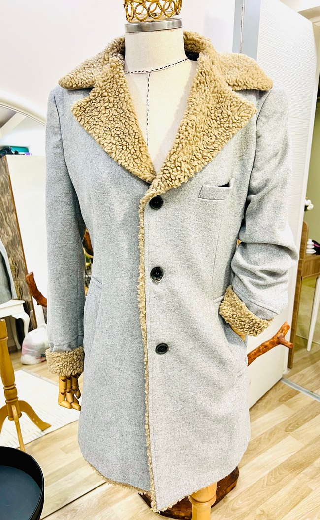 Gri midi kaban, kürk detaylı yakası ve uzun kollu. Rahat kesimi ve sıcak tutan fleece astarıyla sokak stiline uygun.