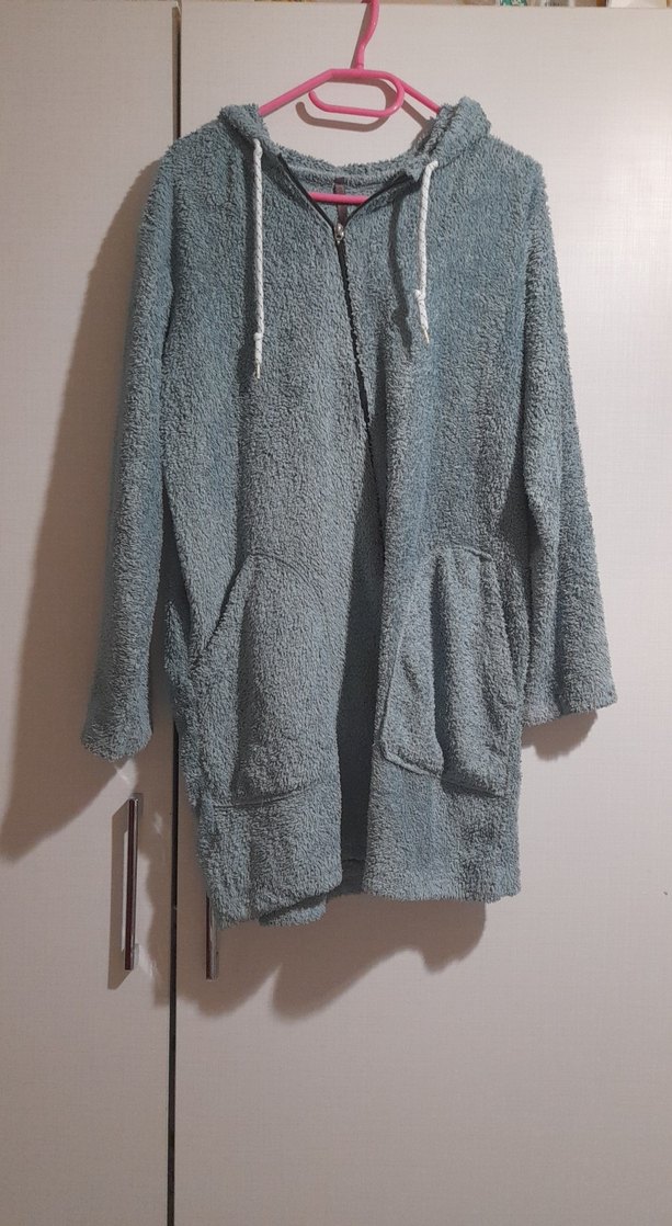 Gri renkte, kapüşonlu ve uzun kollu midi uzunlukta, rahat kesim kadın sabahlık. Yumuşak dokulu ve iki ön ceplidir. ️