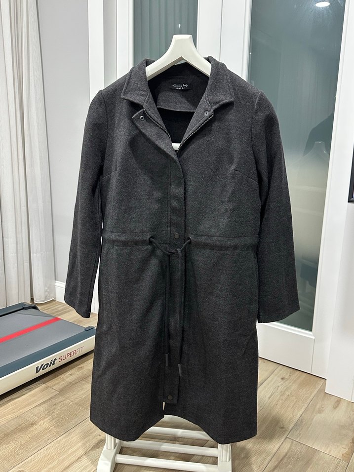 Gri midi kaban, yaka detaylı ve uzun kolludur. Rahat kesimi ve kemeriyle günlük sokak stiline uygundur. Yumuşak ve sıcak kumaştan üretilmiştir.