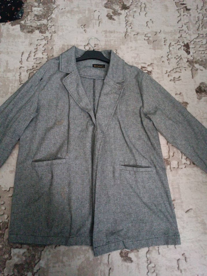 Gri keten kumaştan, düğmeli ve normal kesim midi uzunlukta, uzun kollu, günlük kullanıma uygun kadın ceket.Fotoda detayları gösterilmiştir bu yüzden fiyatı düşük tuttum lekeyi yıkayınca çıkabilir denemedim