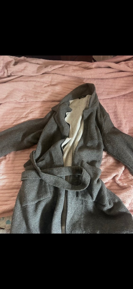 Gri keten kumaştan, normal uzunlukta ve bol kesim kadın palto. Notch yaka, uzun kollu ve kuşaklı, salaş ve şık bir stil sunar. ☁️