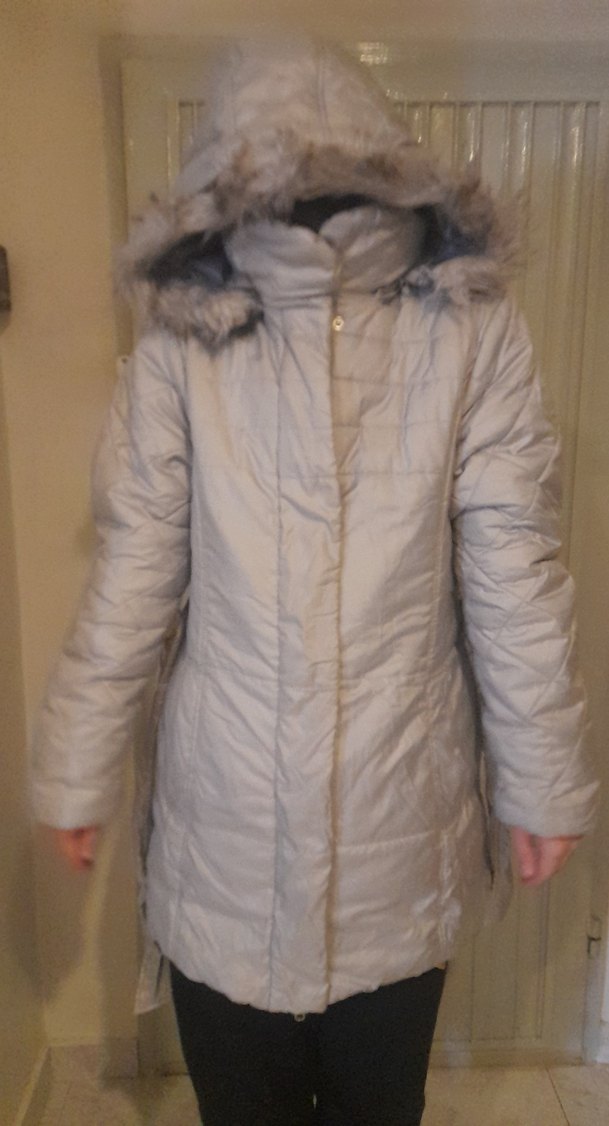 Gri renkte, midi boyda, kürklü kapüşon ve kesimli yaka detaylı, sentetik kumaştan yapılmış, günlük kullanıma uygun, fitted kesim kadın kışlık mont. ❄️