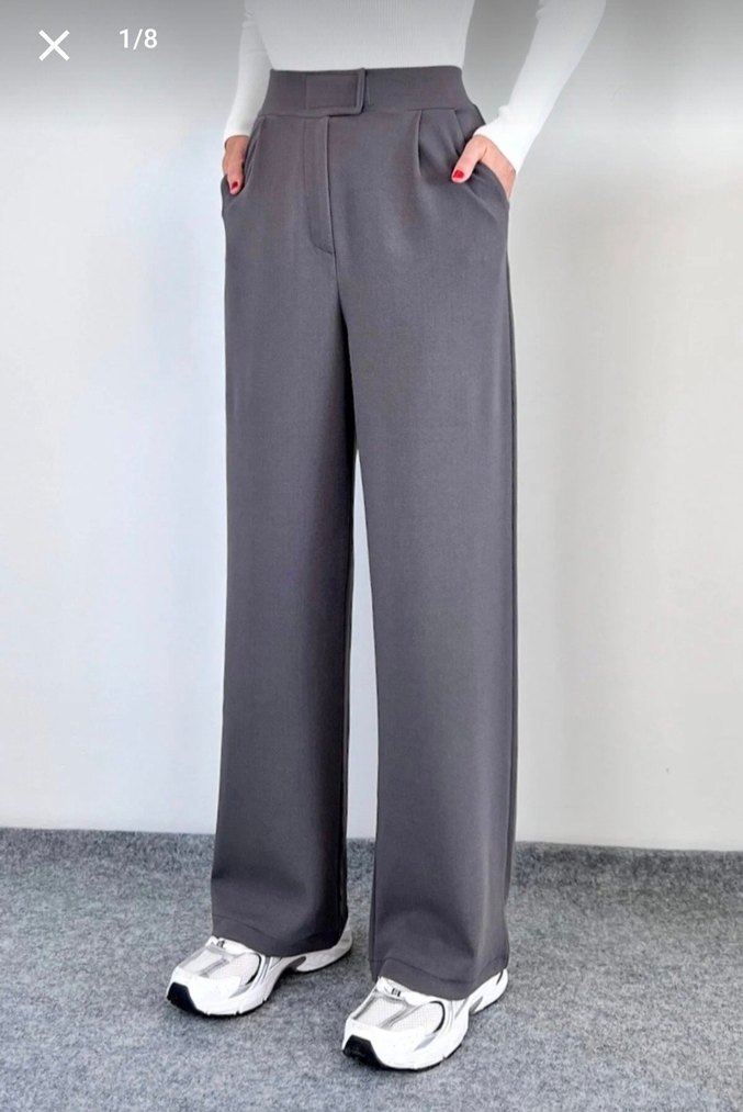 Gri midi uzunlukta, düz kesim kadın pantolon. Sentetik kumaştan, ofis için şık ve rahat bir tercih.