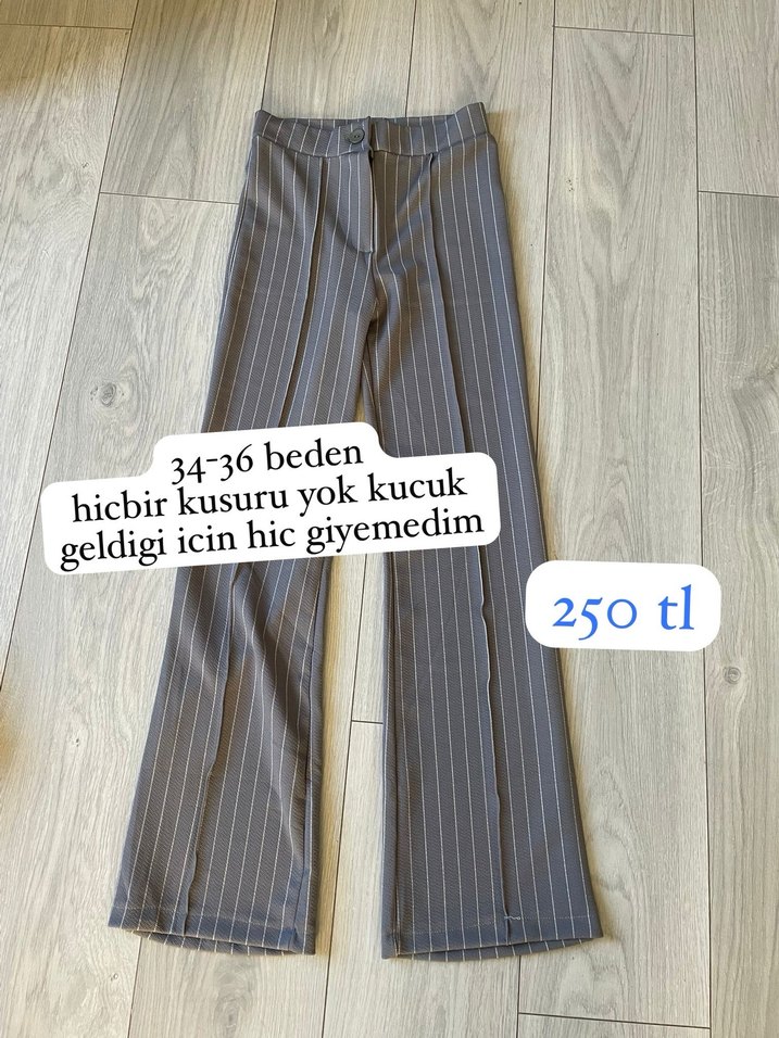 Gri, midi boy, regular kesim, pileli kadın kumaş pantolon. Sentetik kumaştan, iş ve günlük kullanıma uygun. 34-36 beden, hiç kullanılmamış.
