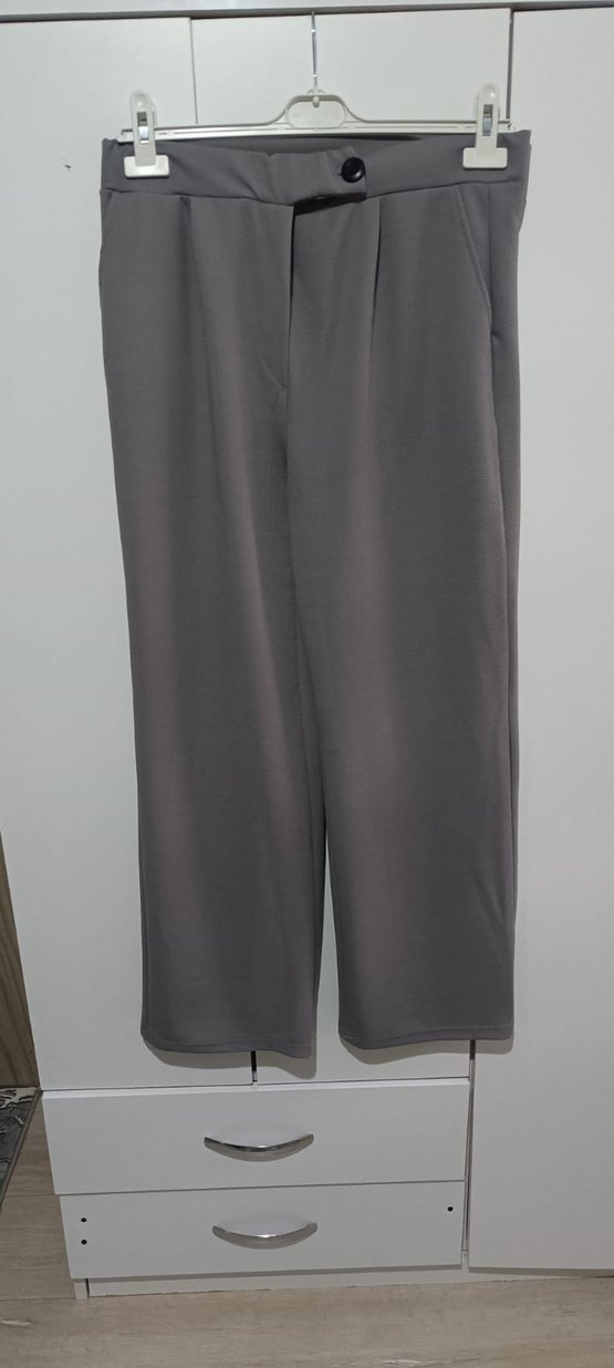 Gri midi uzunlukta, rahat kesim kadın kumaş pantolon. Düz ve desensiz, ofis için sade ve şık bir tercihtir. Yumuşak sentetik kumaştan üretilmiştir.