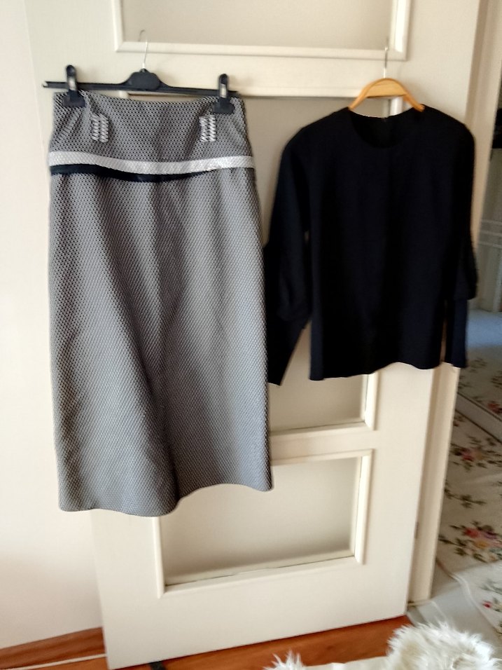 Kadınlar için gri midi boy regular fit etek ve siyah uzun kollu yuvarlak yaka bluz, sentetik kumaştan yapılmıştır. Desensiz, iş ortamına uygun sade ve zahmetsiz şıklık sunar. gömlek az kullanıldı etek yeni
