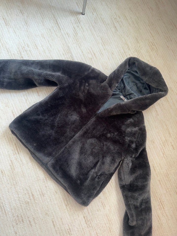 Gri midi uzunlukta peluş kadın mont, yumuşak fleece kumaştan ve notched lapel yakalıdır. Uzun kollu, bol kesim, sade ve desensiz tasarımı günlük kullanıma uygundur.