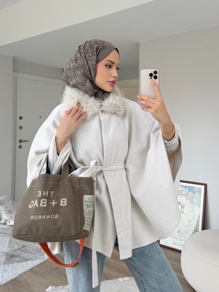 Gri Midi Kadın Poncho - Yün, Kürklü