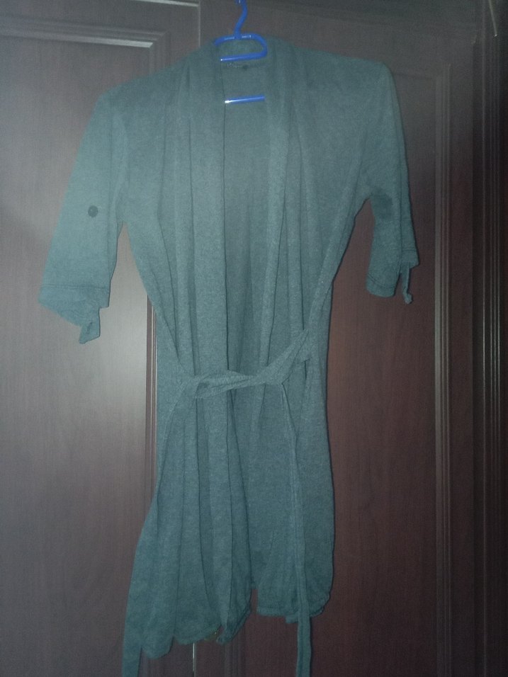 koyu gri renkte, midi boy, kısa kollu ve bol kesim kadın sabahlık. Rahat ve sade tasarımıyla konfor sağlar, kemer detayı bulunur. ️çok az kullanildi