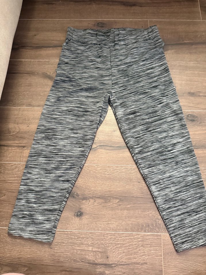 Esnek bel bantlı, gri midi kadın spor tayt, yumuşak sentetik kumaştan, spor ve günlük kullanım için uygundur. ♀️