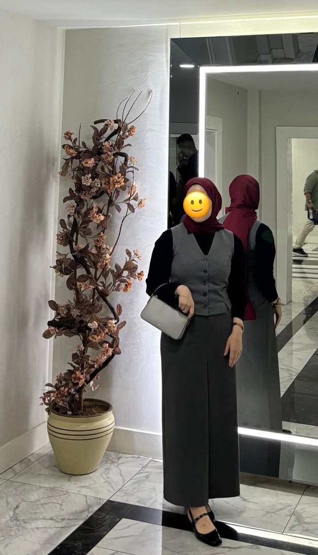 Gri midi kadın takımı, kolsuz ve yaka detaylıdır. Sentetik kumaştan, düzenli kesimle iş ortamına uygun sade ve şık bir görünüme sahiptir. Bir kere giyilmiştir