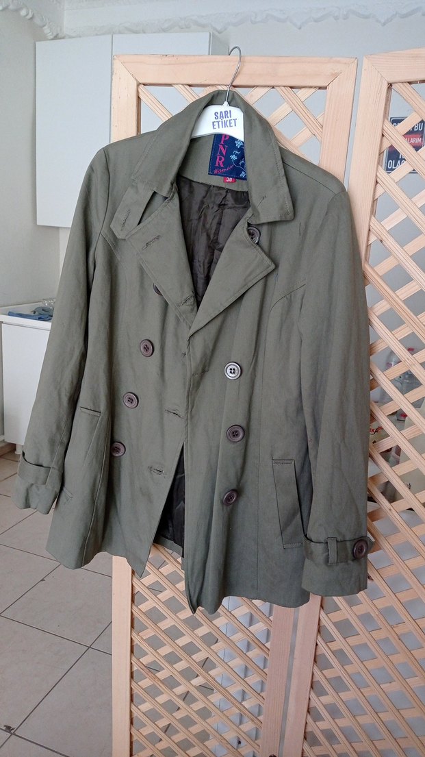 Gri midi uzunlukta, düğmeli, yakalı ve uzun kollu kadın trençkot. Sentetik kumaştan, rahat kesim, günlük sokak stili için uygun.