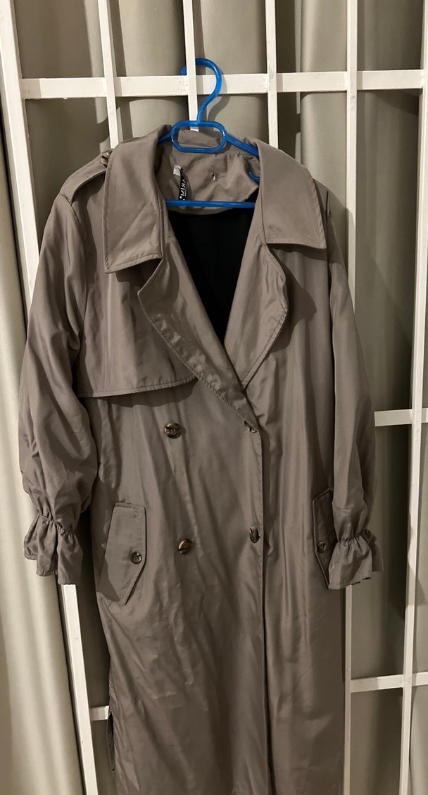 Gri midi uzunlukta, düğmeli, notlu yaka ve bol kesim kadın trençkot. Uzun kollu ve sentetik kumaştan yapılmıştır, günlük kullanıma uygundur. ️ 3844 arası uyumludur