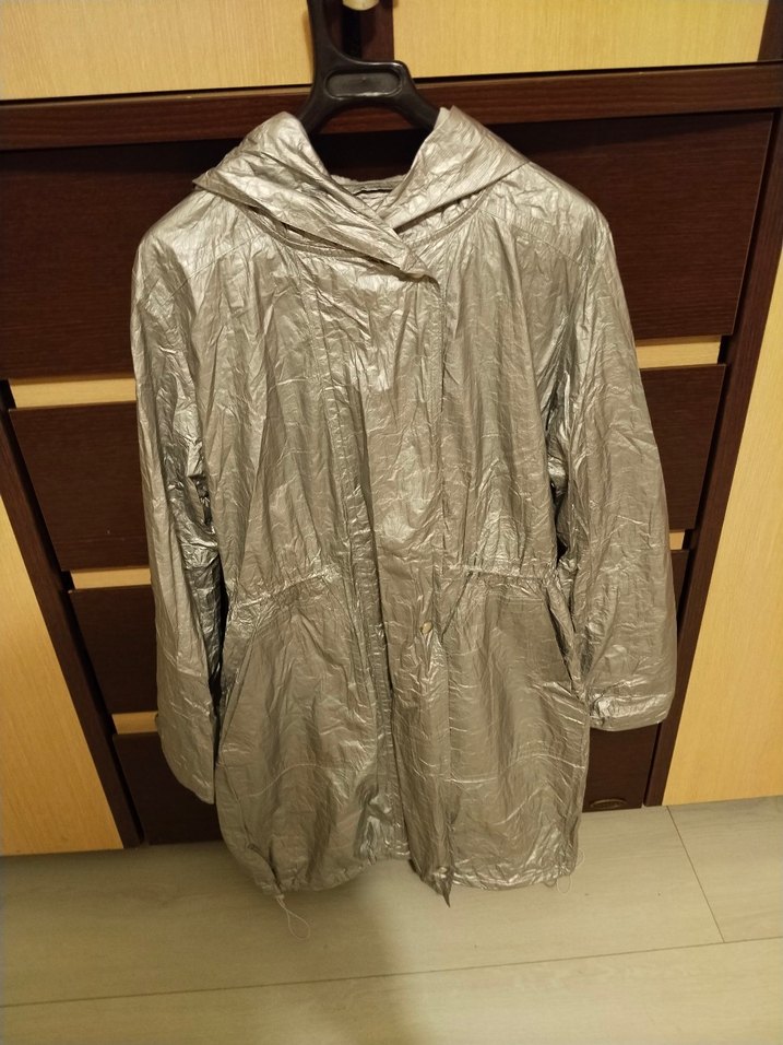 Gri renkte,parlak kumaştan uzun boy, uzun kollu ve kapişonlu detaylı bol kesim yağmurluk. Rahat, avant-garde sokak stili için drapeli tasarım içerir. ️