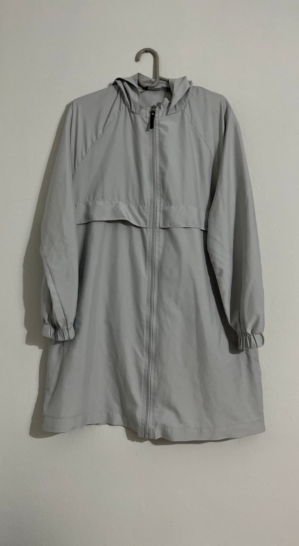 Gri midi boy kadın yağmurluk, yüksek yakalı ve lastikli uzun kolludur. Sentetik kumaştan, rahat ve minimalist tarzda günlük kullanım için uygundur. ️boyu 83 cm bir iki kere giyildi