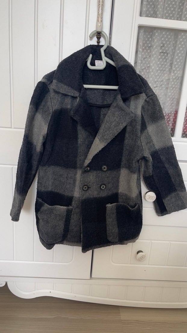 Gri yün kaban, düğmeli ve kesik yaka detaylıdır. Gevşek kesimi, uzun kollu ve midi boyda, günlük sokak stili için uygundur.
