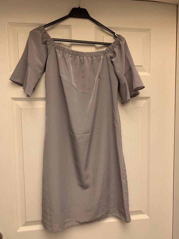 Gri midi uzunlukta, kayık yaka ve kısa kollu kadın elbisesi, salaş kesim ve drapeli detaylarla. Yumuşak ve ipeksi kumaştan, günlük kullanım için uygun minimalist bohem tarzda.