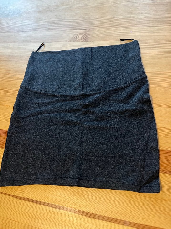 Gri renkte, kemerli ve midi boyda, yumuşak sentetik kumaştan yapılmış, vücuda oturan etek.