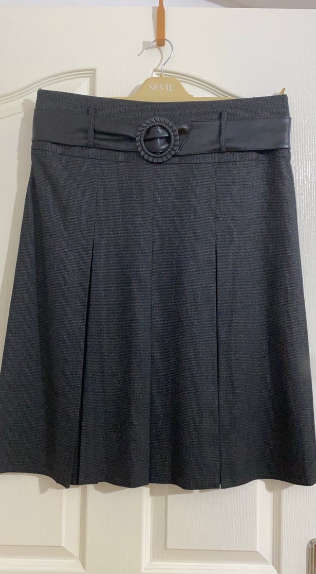 Gri midi uzunlukta, kemerli ve düz kesim kadın eteği. Ofis için uygun, klasik ve gotik tarzı yansıtan sentetik kumaştan yapılmıştır.