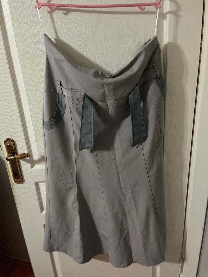 Kemer detayı bulunan, sentetik kumaştan yapılmış, fitted kesim gri midi etek. Düz ve desensiz tasarımı günlük kullanıma uygundur.