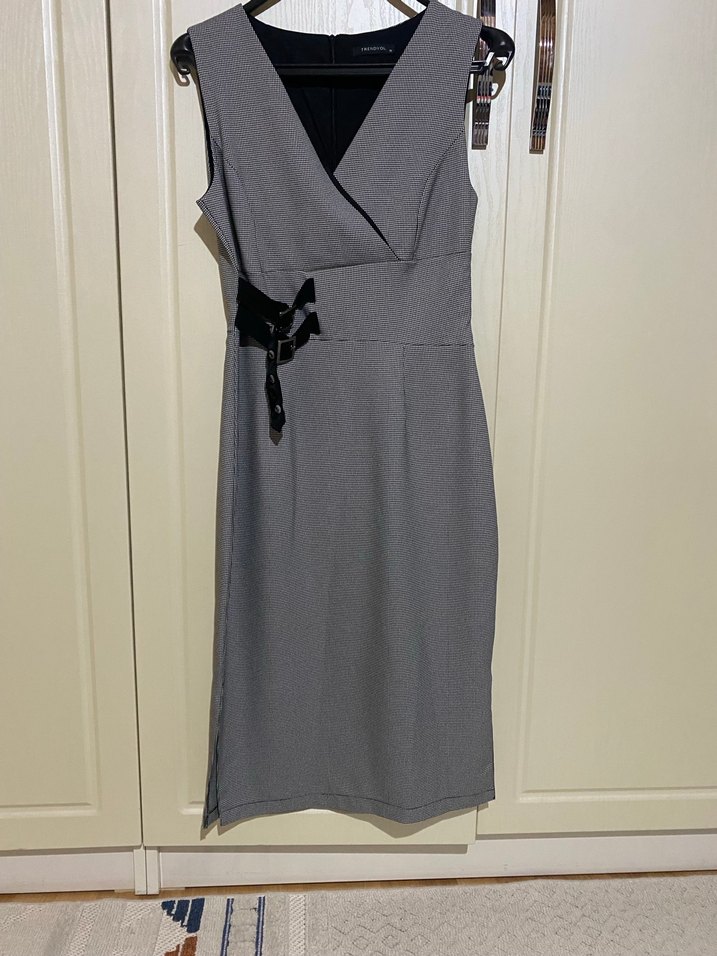 Kolsuz, V yaka, kemerli gri midi elbise, ofis için uygun