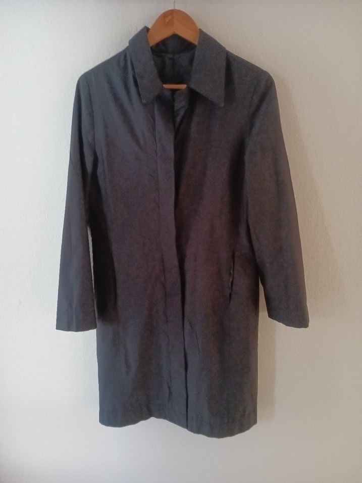 Gri renkte, keten kumaştan yapılmış, düğmeli ve normal boy midi hamile ceketi. Uzun kollu ve regular fit tasarıma sahiptir, ofis kullanımı için uygundur.