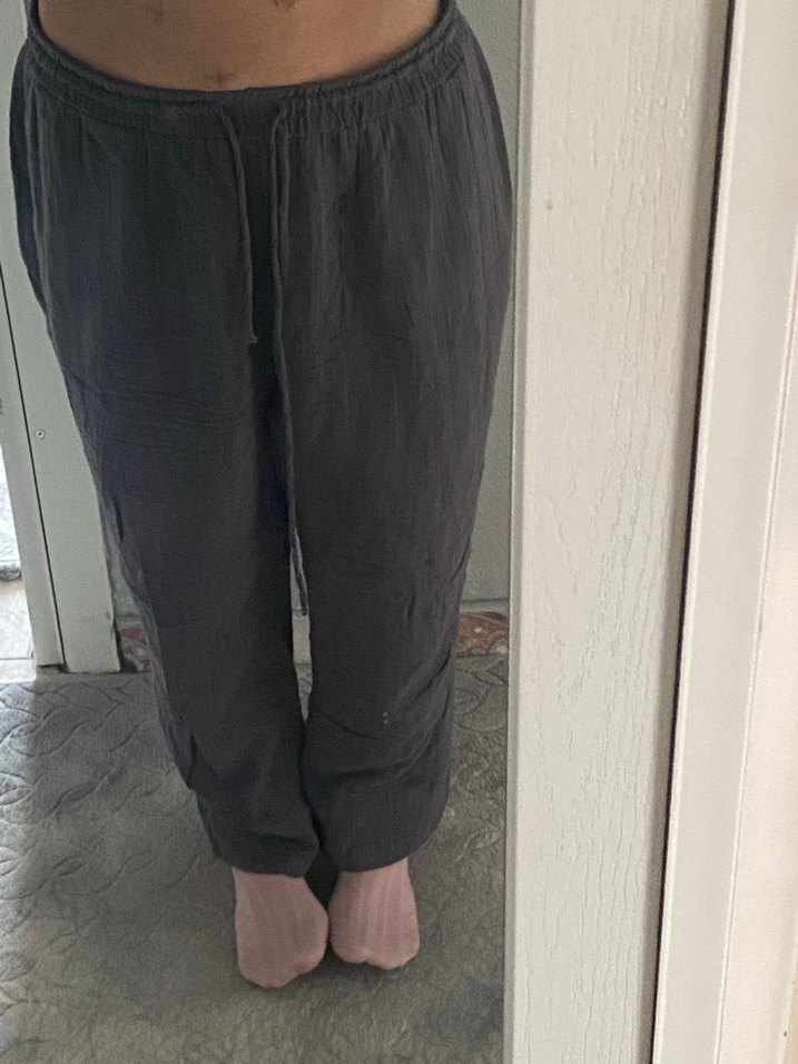 Nefes alabilen keten kumaştan yapılmış, gri midi uzunlukta, bol kesim kadın pantolon. Günlük rahat ve şık görünüm için idealdir.