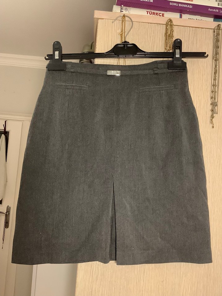 Gri renkte, keten kumaştan, kemerli ve önü yırtmaçlı midi kalem etek. Ofis için uygun, rahat kesim.