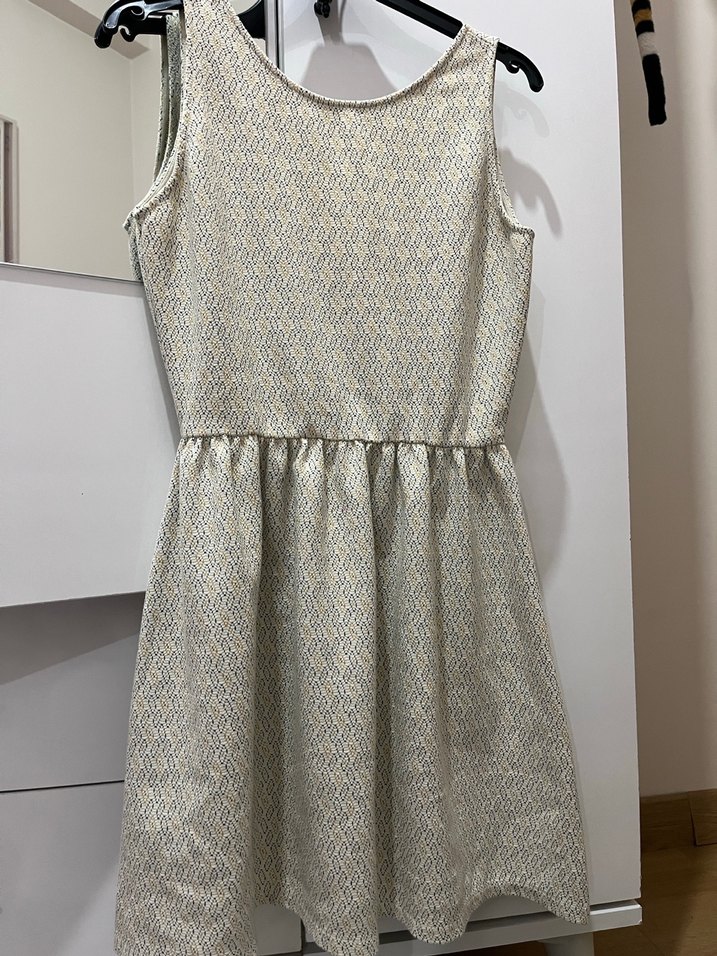 Gri renkte, kolsuz ve pilili etekli midi uzunlukta kadın elbisesi. Düz ve şık, regular fit kesime sahip. Sentetik yumuşak kumaştan üretilmiştir.
