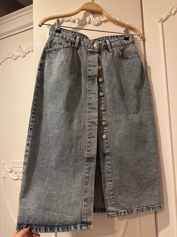 Gri renkte, kemerli ve midi kot etek. Sade desensiz, günlük ve sokak modasına uygun bir tasarıma sahiptir. Arkada cepleri bulunur.