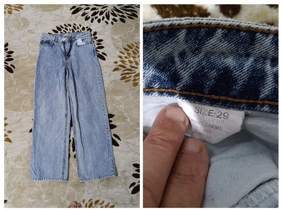 Mavi denim kot pantolon, salaş kesim ve midi boyda, yırtmaç detayıyla rahat bir görünüm sunar. Günlük kullanıma uygun, desensiz tasarımdır.